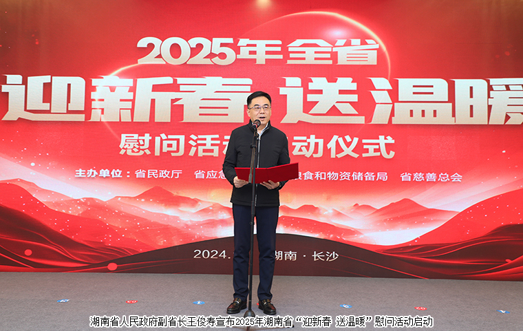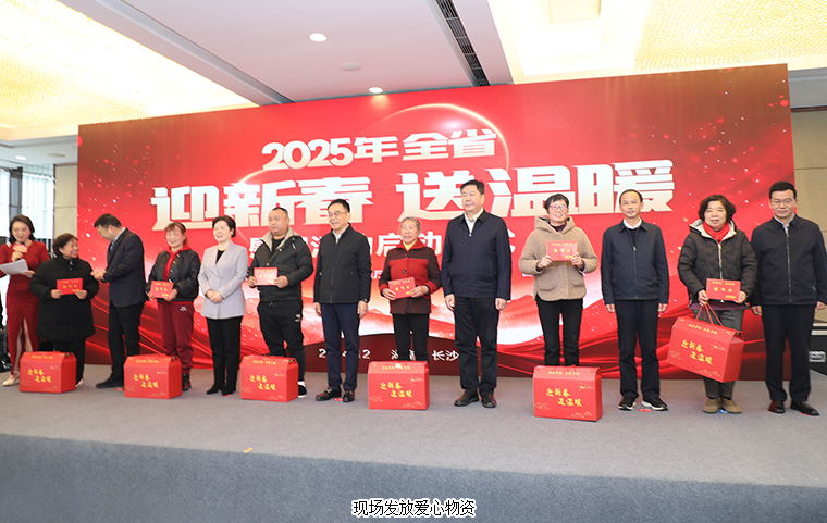 隨后,湖南省人民政府副省長王俊壽、湖南省人民政府辦公廳一級巡視員孟祥定,湖南省民政廳廳長黃東紅,中共湖南省委宣傳部二級巡視員楊勇,湖南省應急管理廳黨委委員、副廳長朱毅,湖南省糧食和物資儲備局黨組成員、副局長覃世民等領導上臺為困難群眾代表發(fā)放愛心物資。湖南省人民政府副省長王俊壽宣布2025年湖南省“迎新春 送溫暖”慰問活動正式啟動。