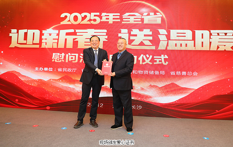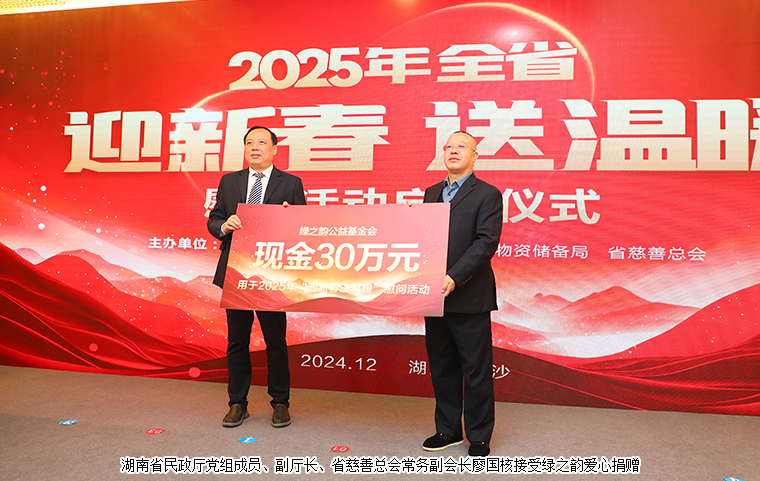 民政擔當,溫暖湖湘。2024年12月25日,2025年湖南省“迎新春 送溫暖”慰問活動啟動儀式在長沙舉行。湖南省人民政府副省長王俊壽,湖南省人民政府辦公廳一級巡視員孟祥定,湖南省民政廳廳長黃東紅,湖南省民政廳黨組成員、副廳長、省慈善總會常務副會長廖國核,中共湖南省委宣傳部二級巡視員楊勇,湖南省應急管理廳黨委委員、副廳長朱毅,湖南省糧食和物資儲備局黨組成員、副局長覃世民等領導出席活動。湖南省慈善總會副會長、綠之韻集團董事長胡國安受邀參加活動,并代表綠之韻公益基金會向湖南省慈善總會捐贈30萬元愛心款項參與幫扶困難群眾。
