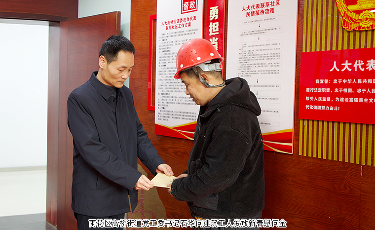 活動(dòng)現(xiàn)場(chǎng),雨花區(qū)高橋街道黨工委書記石華和人大代表們向建筑工人發(fā)放新春慰問金。每一份慰問金都飽含著對(duì)群眾的關(guān)心與祝福,傳遞著黨和政府對(duì)他們的深切關(guān)懷。工人們接過慰問金,臉上也洋溢出溫暖的笑容。雨花區(qū)高橋街道黨工委書記石華表示,街道將繼續(xù)關(guān)注建筑工人的生活和工作情況,積極為他們解決實(shí)際問題。同時(shí)也將加強(qiáng)與人大代表的溝通協(xié)作,共同推動(dòng)街道各項(xiàng)工作高質(zhì)量開展。