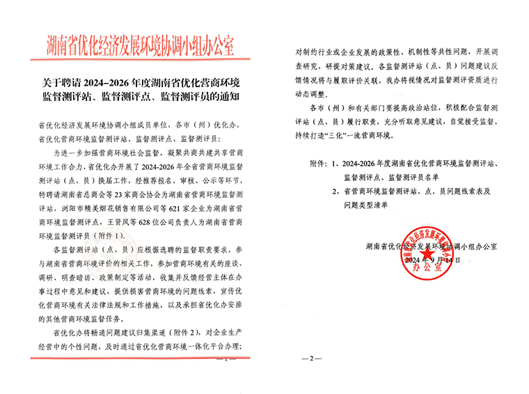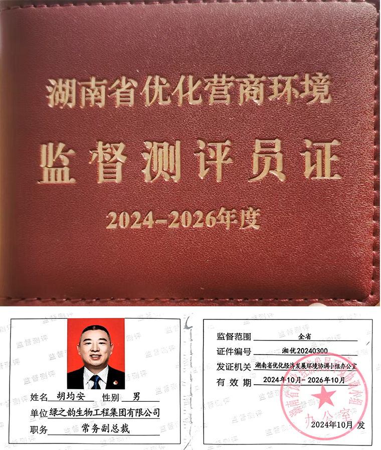 為進(jìn)一步加強(qiáng)營商環(huán)境社會(huì)監(jiān)督,凝聚共商共建共享營商環(huán)境工作合力,湖南省優(yōu)化經(jīng)濟(jì)發(fā)展環(huán)境協(xié)調(diào)小組辦公室開展了2024—2026年度湖南省營商環(huán)境監(jiān)督測評(píng)站(點(diǎn)、員)換屆工作,經(jīng)推薦報(bào)名、審核、公示等環(huán)節(jié),綠之韻集團(tuán)憑借在企業(yè)經(jīng)營發(fā)展、社會(huì)責(zé)任擔(dān)當(dāng)以及行業(yè)內(nèi)的良好口碑等多方面的突出表現(xiàn),獲聘為“2024-2026年度湖南省優(yōu)化營商環(huán)境監(jiān)督測評(píng)點(diǎn)”。綠之韻集團(tuán)常務(wù)副總裁胡均安獲聘為“湖南省優(yōu)化營商環(huán)境監(jiān)督測評(píng)員”。