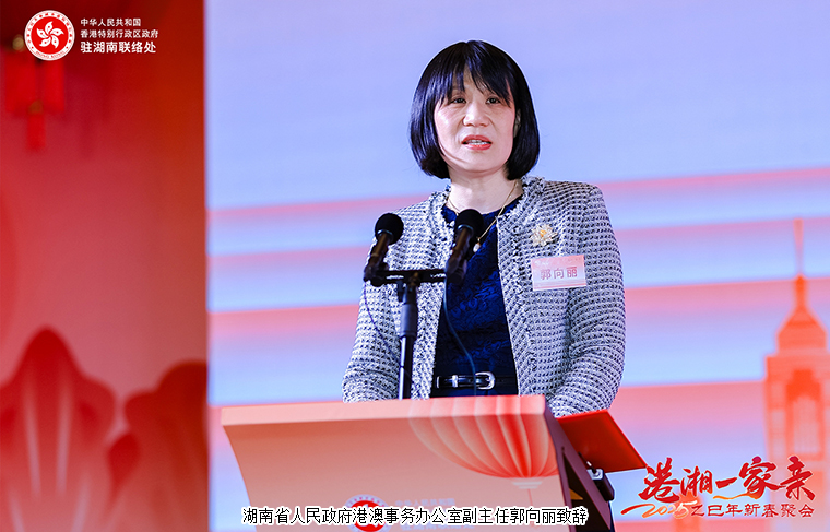 湖南省人民政府港澳事務(wù)辦公室副主任郭向麗向出席嘉賓送上新春祝福并代表湖南省人民政府港澳事務(wù)辦公室向香港各界的朋友致以熱烈的歡迎,向長(zhǎng)期以來(lái)關(guān)心和支持湖南發(fā)展的各界人士致以衷心的感謝。她表示,自改革開(kāi)放以來(lái),兩地經(jīng)濟(jì)文化交流頻繁,香港企業(yè)家在湖南投資興業(yè),湖南企業(yè)也通過(guò)香港資本市場(chǎng)發(fā)展壯大。近年來(lái),兩地貿(mào)易額顯著增長(zhǎng),文化教育交流日益密切,香港青年在湖南學(xué)習(xí)紅色精神,湖南學(xué)子通過(guò)游學(xué)計(jì)劃走進(jìn)香港,文化紐帶進(jìn)一步拉近了兩地距離。當(dāng)前,湖南正全力打造國(guó)家重要支點(diǎn),香港則承擔(dān)著國(guó)家戰(zhàn)略中的重要使命,兩地在國(guó)家戰(zhàn)略布局中具有廣闊的合作空間。她希望香港朋友把握歷史機(jī)遇,與湖南攜手推進(jìn)經(jīng)貿(mào)、產(chǎn)業(yè)、科技、人文、綠色等多領(lǐng)域的合作,利用香港“一國(guó)兩制”的獨(dú)特優(yōu)勢(shì),成為湖南連接世界的橋梁。最后,她以“恰同學(xué)少年,風(fēng)華正茂”詩(shī)句勉勵(lì)大家,共同為中華民族偉大復(fù)興貢獻(xiàn)力量,譜寫(xiě)湘港合作的新篇章。