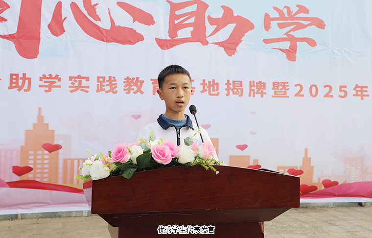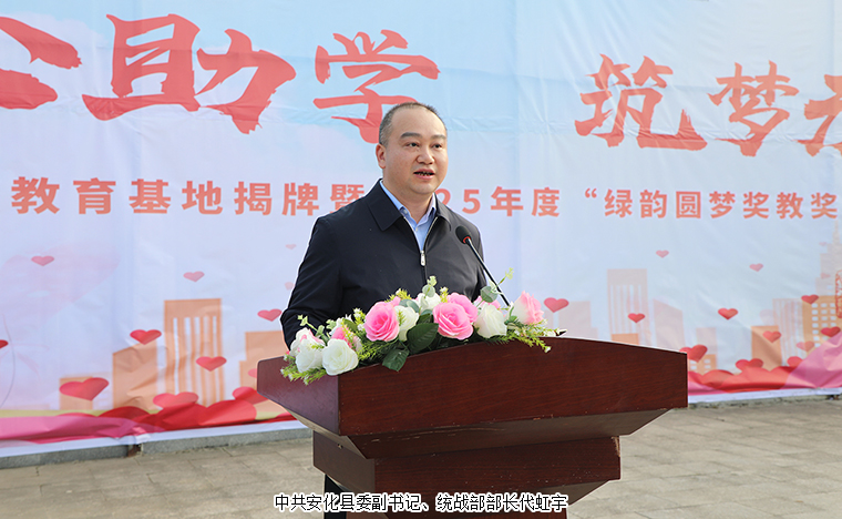 中共安化縣委副書記、統(tǒng)戰(zhàn)部部長代虹宇致歡迎辭。他首先對一直大力支持教育事業(yè)的綠之韻集團(tuán)愛心團(tuán)隊(duì)給予高度贊許。同時(shí)表示,2021年,致公黨湖南省委員會與我縣簽訂《助力鄉(xiāng)村振興戰(zhàn)略“致安合作”框架協(xié)議》,通過產(chǎn)業(yè)幫扶、教育助學(xué)、醫(yī)療義診等務(wù)實(shí)舉措,累計(jì)投入幫扶資金860萬元,實(shí)施項(xiàng)目 23個,為安化鄉(xiāng)村振興注入強(qiáng)勁動能。胡國安董事長設(shè)立“綠韻圓夢”獎教獎學(xué)金,已經(jīng)連續(xù)三年每年向?qū)W校捐贈人民幣10萬元整,累計(jì)惠及師生420人次,彰顯了新時(shí)代企業(yè)家的教育情懷和責(zé)任擔(dān)當(dāng)。安化大橋?qū)W校作為冷市鎮(zhèn)教育的窗口,近年來在各方支持下,辦學(xué)條件顯著改善,教學(xué)質(zhì)量穩(wěn)步提升。今天實(shí)踐教育基地揭牌,既是總結(jié)更是啟航。期盼學(xué)校深化合作,在課程共建、師資培育等方面創(chuàng)新突破,打造鄉(xiāng)村教育振興示范樣本。希望同學(xué)們立鴻鵠志、做追夢人,將感恩之心轉(zhuǎn)化為“強(qiáng)國有我”的奮斗力量,讓青春在傳遞愛心中綻放光彩。讓我們以此次活動為新起點(diǎn),凝聚各方力量,厚植教育情懷,持續(xù)推動城鄉(xiāng)教育優(yōu)質(zhì)均衡發(fā)展,為鄉(xiāng)村振興培育更多生力軍。