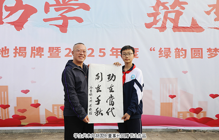 在全場領(lǐng)導(dǎo)嘉賓的見證下,湖南省人大常委會副主任、致公黨省委會主委胡旭晟,中共安化縣委副書記、統(tǒng)戰(zhàn)部部長代虹宇,冷市鎮(zhèn)中心學(xué)校校長張亮,綠之韻集團(tuán)董事長胡國安共同為“致公助學(xué)實(shí)踐教育基地”揭牌,標(biāo)志著安化大橋?qū)W校成為致公黨湖南省委會與綠之韻公益基金會教育幫扶的重要基地,助力安化縣實(shí)施鄉(xiāng)村振興文化振興、教育振興。學(xué)生代表向胡國安董事長、胡均安常務(wù)副總裁回贈了精心創(chuàng)作的書法及主題繪畫作品,筆觸間飽含感恩與感激之情。