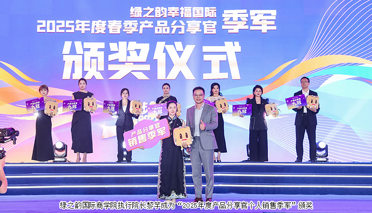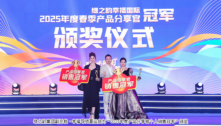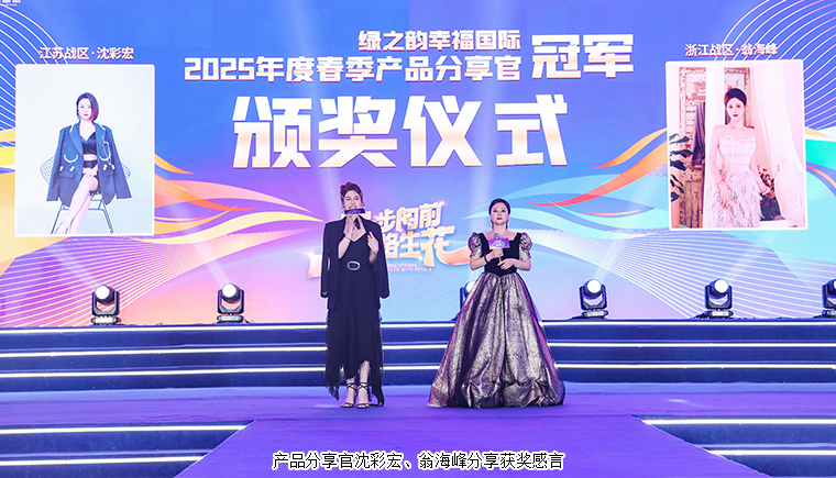 在風云變幻的市場上,他們以智慧和汗水書寫銷售傳奇。每一次成功的分享,都是努力的結(jié)晶;每一個客戶的認可,都是奮斗的勛章。他們用實力證明,只要心懷夢想,全力以赴,就能在舞臺上綻放最耀眼的光芒。綠之韻集團副總裁·幸福導(dǎo)師夏運良為“2025年度產(chǎn)品分享官個人銷售冠軍”的獲得者江蘇戰(zhàn)區(qū)沈彩宏、浙江戰(zhàn)區(qū)翁海峰頒獎。