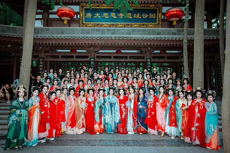華袍錦裳袂若仙,一夢(mèng)千年越長(zhǎng)安。綠之韻家人們身著曳地襕袍,輕裹織金羅裙,步搖輕顫中更顯仕女端麗,信步踏入「長(zhǎng)安十二時(shí)辰」街區(qū) —— 雕梁畫棟間浮動(dòng)著唐宮香篆,胡商貨攤與彩樓旗幡交相輝映,恍若化身為貞觀年間的貴胄子弟,在酒肆茶坊間拾掇千年光陰。轉(zhuǎn)過坊墻,大慈恩寺遺址公園的禪意撲面而來。雁塔影落碧池,銀杏葉染秋光,家人們于古槐下合十靜立,攝影師鏡頭里收盡襦裙廣袖的典雅氣韻,歷史厚重感與文化自信在快門聲中凝成永恒注腳。暮色浸透時(shí),大唐不夜城的鎏光燈河轟然點(diǎn)亮。家人們羅衣飄帶拂過現(xiàn)代潮玩店的櫥窗,在古今交融的街巷里織就流動(dòng)的盛唐長(zhǎng)卷。每一張定格的照片里,都封存著穿越千年的風(fēng)雅與此刻的歡暢。