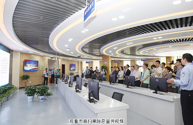 通過市局民警現(xiàn)場引導(dǎo)和解說,參觀組一行依次探訪了刑事技術(shù)大樓的視頻偵查中心、反電詐中心、掃黑除惡研判中心,實地了解了市局視頻偵查技術(shù)在偵破打擊及掃黑除惡專項斗爭中的作用,反電詐中心運作情況,市局掃黑辦日常運行工作情況及刑偵支隊“悅警廳”及支隊警營文化建設(shè),集中觀看了市局掃黑除惡宣傳視頻和公安機關(guān)掃黑除惡專項斗爭中繳獲的各類涉案物品等。