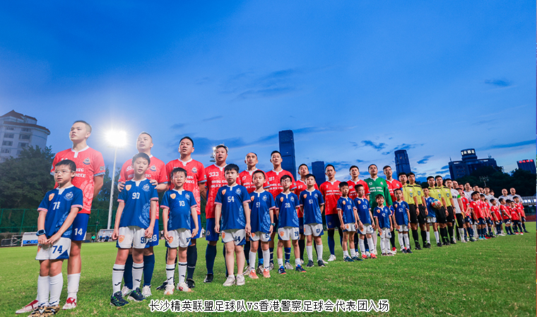 19:30,長(zhǎng)沙精英聯(lián)盟足球隊(duì)VS香港警察足球會(huì)代表團(tuán)入場(chǎng)式拉開(kāi)帷幕。國(guó)旗飄揚(yáng)中,球員們牽著球童步入賽場(chǎng),莊嚴(yán)的國(guó)歌奏響,現(xiàn)場(chǎng)氛圍莊重?zé)崃摇iL(zhǎng)沙市海外聯(lián)誼會(huì)會(huì)長(zhǎng)劉匯在長(zhǎng)沙市足協(xié)主席魏華松陪同下,與首發(fā)球員親切握手并為本場(chǎng)比賽開(kāi)球,隨著足球踢出,這場(chǎng)備受矚目的比賽正式開(kāi)啟。