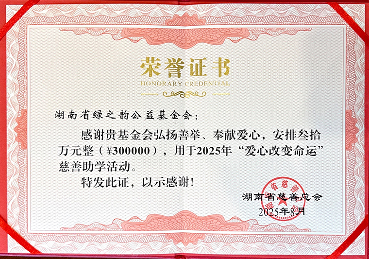 知識改變命運,愛心鑄就未來。愛心企業(yè)、愛心單位線上線下齊發(fā)力。今年8月,綠之韻公益基金會攜手湖南省慈善總會、芒果公益平臺開啟“愛心改變命運”助學季,上線“2025愛心改變命運”網(wǎng)絡籌款募捐項目,向社會籌措助學資金,資助湖南省內(nèi)勵志學子圓夢大學。此次活動現(xiàn)場,勞嘉總裁代表綠之韻集團向“愛心改變命運”項目捐資30萬,為圓勵志學子大學夢貢獻一份力量。