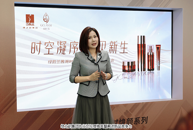 伴隨著綠韻蘭茜溯時煥顏新品宣傳片首度亮相,綠之韻集團總裁勞嘉、市場營銷中心總經(jīng)理戴三省、執(zhí)行總經(jīng)理梅其慧、常務副總經(jīng)理蔣文、市場運營中心國際商學院院長侯俊霞與劉天奇博士共同登臺,在璀璨的光影中為新品完成揭幕儀式。