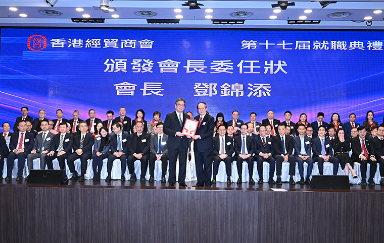 2026年1月15日,香港經(jīng)貿(mào)商會第十七屆就職典禮隆重舉行。香港特別行政區(qū)商務(wù)及經(jīng)濟發(fā)展局局長丘應(yīng)樺擔任主禮嘉賓。香港中華廠商聯(lián)合會會長盧金榮,香港工業(yè)總會主席林世豪,香港中華出入口商會會長貝鈞奇,香港生產(chǎn)力促進局主席陳祖恒,香港立法會議員林振升、陳穎欣,老撾人民民主共和國駐港澳領(lǐng)事館總領(lǐng)事AMMALA、大韓民國駐港澳領(lǐng)事館總領(lǐng)事千成煥、全港各區(qū)工商聯(lián)會長楊凱山,香港中小型企業(yè)總商會會長黎卓斌,香港中小型企業(yè)聯(lián)合會會長郭志華等領(lǐng)導(dǎo)嘉賓應(yīng)邀出席。香港長沙商會會長、香港立基環(huán)球有限公司董事長鄧錦添當選香港經(jīng)貿(mào)商會第十七屆會長,香港長沙聯(lián)誼會會長、綠之韻集團董事長胡國安當選副會長。與會嘉賓齊聚一堂,共慶盛事、共謀發(fā)展。