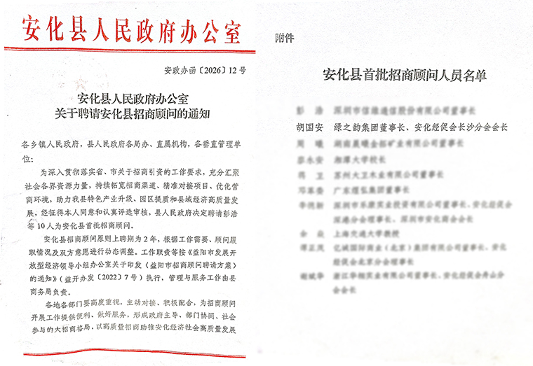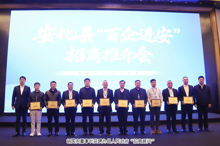 鄉(xiāng)友回歸,既要引得來,更要留得住、發(fā)展好;產(chǎn)業(yè)振興,既要搭平臺,更要聚人才、強支撐。為進(jìn)一步匯聚鄉(xiāng)賢力量、拓寬招商渠道,本次招商推介會上,安化縣專門聘任10位各界精英擔(dān)任 “招商顧問”,以商引商、以情聚商,為家鄉(xiāng)高質(zhì)量發(fā)展注入更強動能。長沙市安化商會會長、綠之韻集團(tuán)董事長胡國安憑借深厚的家鄉(xiāng)情懷、廣泛的行業(yè)影響力與豐富的資源優(yōu)勢,獲聘為安化縣人民政府“招商顧問”。