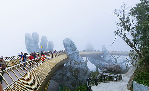 來到巴拿山,便仿佛來到了書里的童話世界。綠之韻家人們乘坐著世界吉尼斯單線最長、落差最大的懸索纜車上山后,首先便來到了火熱一時的網(wǎng)紅景點——佛手橋打卡。從外觀來看,佛手橋看起來就像是兩只巨大的手掌將一座金橋像浮塵一樣托在手掌中。從橋的一端向另一端看,橋上的家人們仿佛是在煙霧繚繞的云層中行走。在位于海拔1400米的巴拿山頂,還有一座法國小鎮(zhèn)。小鎮(zhèn)上有著東南亞最大的機動游樂場,堪稱越南“迪士尼”,家人們仿佛回到童年的孩子一樣,愉快的在城堡中玩耍著各種娛樂設(shè)施,重溫著童年的樂趣。
