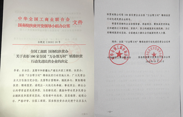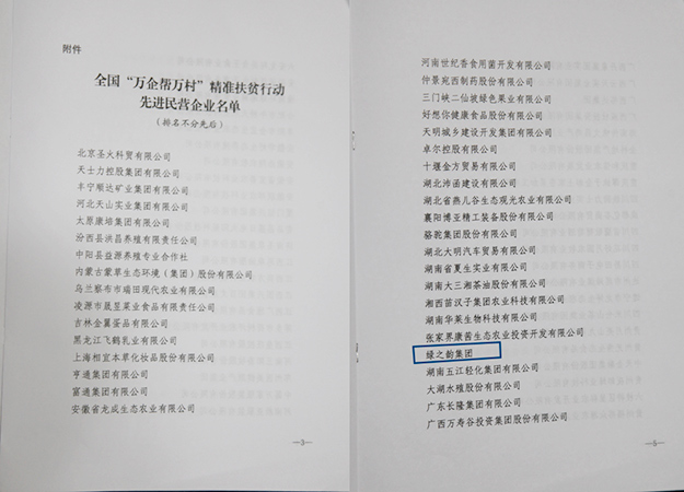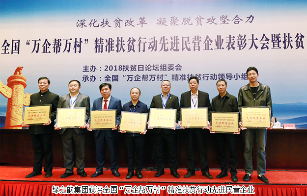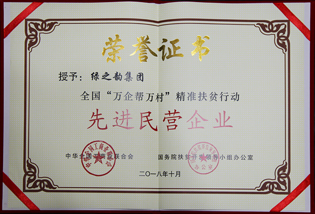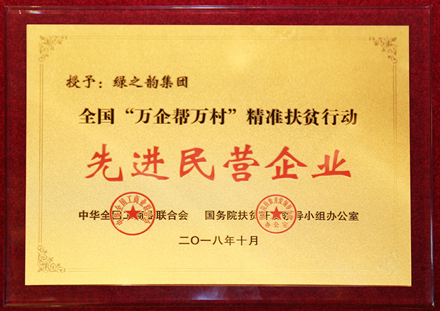 為表彰先進(jìn)、激勵(lì)和帶動(dòng)更多民營企業(yè)踴躍投身脫貧攻堅(jiān)戰(zhàn),經(jīng)報(bào)請中央批準(zhǔn),層層推薦、逐級(jí)公示、嚴(yán)格評審,中華全國工商業(yè)聯(lián)合會(huì)、國務(wù)院扶貧辦授予100家民營企業(yè)全國“萬企幫萬村”精準(zhǔn)扶貧行動(dòng)先進(jìn)民營企業(yè)稱號(hào)。綠之韻集團(tuán)勇于擔(dān)當(dāng)社會(huì)責(zé)任,在企業(yè)健康發(fā)展的同時(shí),發(fā)揚(yáng)中華民族扶危濟(jì)困的優(yōu)良傳統(tǒng),聚焦精準(zhǔn)扶貧加強(qiáng)模式創(chuàng)新,為廣大民營企業(yè)做出了表率,被中華全國工商業(yè)聯(lián)合會(huì)、國務(wù)院扶貧開發(fā)領(lǐng)導(dǎo)小組辦公室評為全國“萬企幫萬村”精準(zhǔn)扶貧行動(dòng)先進(jìn)民營企業(yè)。