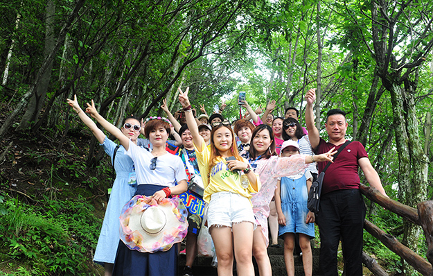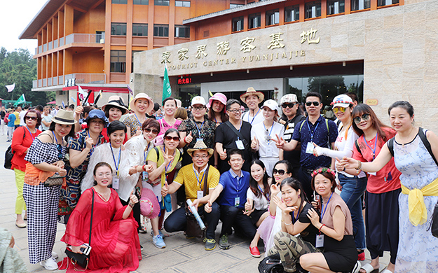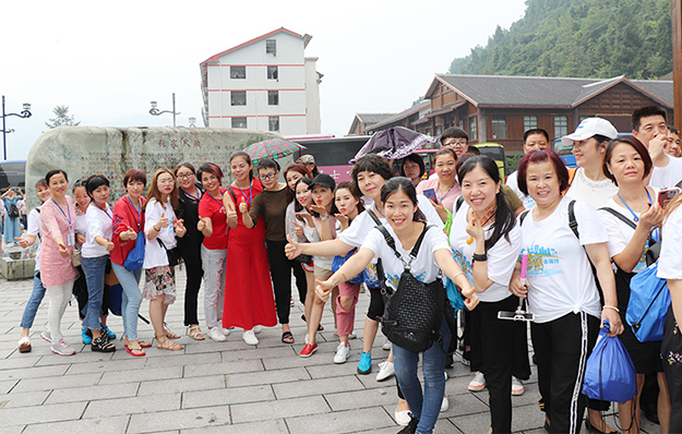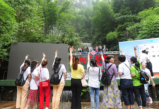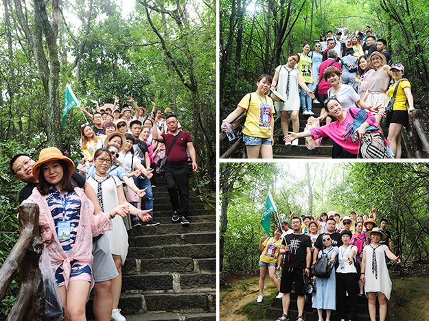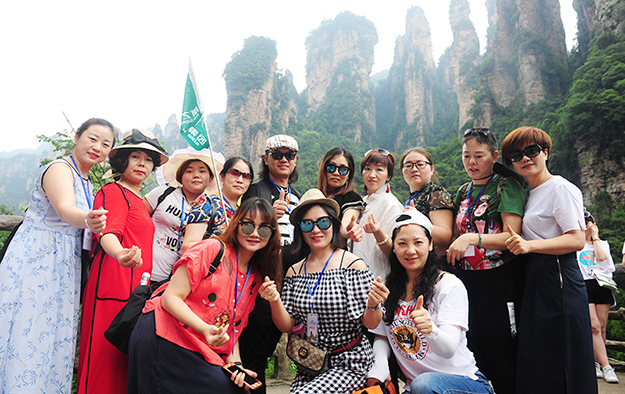 在電影《阿凡達》山峰原型-袁家界景區(qū)、“世界峰林之王”——天子山景區(qū)、十里畫廊,綠之韻營銷精英們深深為那不著雕飾的原始生態(tài)的自然美、飽經風霜的滄桑美、積淀厚重的文化美所吸引,所感動,所震撼。千峰穿云高聳,萬頃松杉蔥蘢,石林百態(tài)千姿,幽谷碧水淙淙。進入景區(qū),綠之韻營銷精英們統(tǒng)一乘坐“世界第一梯”百龍?zhí)焯萆仙?。百龍?zhí)焯輾鈩莼趾?,因其“世界上最高、運行速度最快、載重量最大的電梯”而被載入吉尼斯世界紀錄。家人們乘電梯以5米/秒的速度上山,慷慨科技進步的同時,驚嘆于張家界的高山絕景和大自然的鬼斧神工。雖是炎炎夏日,山上微風徐徐,風景如畫,綠之韻家人們先后游覽了御筆峰、仙女散花、賀龍公園、天子閣、賀龍銅像、賀龍墓、西海峰林等自然奇景,感受淳樸的民情和苗家奇特的民俗,品嘗獨具風味的民族食品。拾級而上,相互鼓勵,跨越過七千多級臺階,走完了全程。一路上,留下了綠之韻人的堅毅腳步和歡聲笑語!