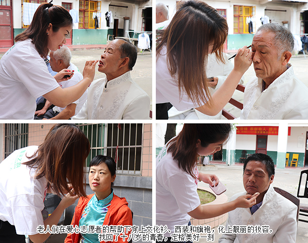 隨后,綠之韻集團(tuán)與瀏陽市國稅局工業(yè)園區(qū)分局的愛心志愿者們走進(jìn)瀏陽洞陽鎮(zhèn)敬老院,給老人們送去溫暖的愛心物資。對于這群大多生于上世紀(jì)50、60年代的老人們來說,18歲的青春不是瑯瑯書聲伴良晨,在動蕩的年代,他們中大多數(shù)人都沒能繼續(xù)讀書,而走進(jìn)社會,盡早養(yǎng)活自己甚至補(bǔ)貼家庭,是他們18歲時必須考慮的事情。夢圓今朝,老人們在愛心志愿者的幫助下穿上青春的文化衫、西裝和旗袍,化上靚麗的妝容,找回了十八歲時青春的心態(tài),在陽光下定格這美好一刻?!拔医Y(jié)婚的時候都沒穿過西裝拍過照”,回想過去的崢嶸歲月,感受今天的幸福生活,老人們既激動又興奮。