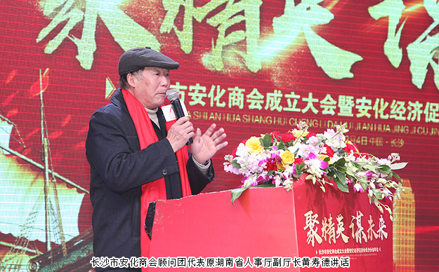 隨后,原湖南省人事廳副廳長黃壽德作為長沙市安化商會顧問團代表講話。他首先對長沙市安化商會的成立致以誠摯的祝賀。他表示,長沙歷史悠久,人杰地靈,眾多優(yōu)秀的安化籍企業(yè)家在這片土地上辛勤創(chuàng)業(yè),把長沙當成實現(xiàn)人生價值的大舞臺,不僅自己成就了事業(yè),也為兩地經(jīng)濟社會發(fā)展作出了應(yīng)有的貢獻。他希望,長沙市安化商會能夠成為安化籍在長人士交流溝通、互幫互助、共同提升的平臺,為長沙和安化的經(jīng)濟文化交流以及兩地經(jīng)濟的互相促進、共同發(fā)展做出更大的貢獻。長沙市民政局黨委副書記、副局長伍仁華在講話中表示,長沙市民政局將一如既往為商會提供優(yōu)質(zhì)的服務(wù),希望廣大安化籍企業(yè)家要繼續(xù)發(fā)揚“致富思源、義利兼顧、戀祖愛鄉(xiāng)、回饋桑梓”的湘商精神,在國家“一帶一路”及湖南“創(chuàng)新引領(lǐng)、開放崛起”戰(zhàn)略的實踐中積極做貢獻,做合法經(jīng)營、誠信經(jīng)營的表率,為湖南的發(fā)展助力,為安化人民爭光。