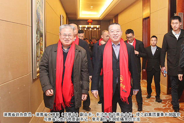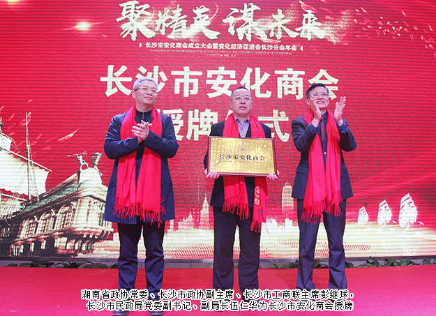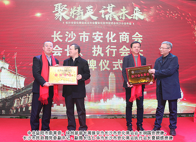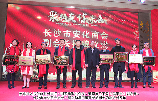 聚精英,謀未來。2018年2月4日,長沙市安化商會成立大會暨安化經(jīng)濟促進會長沙分會年會在長沙舉行。湖南省政協(xié)常委、長沙市政協(xié)副主席、長沙市工商聯(lián)主席彭繼球,中共益陽市委常委、統(tǒng)戰(zhàn)部部長周振宇,安化縣人民政府縣長肖義,長沙市民政局黨委副書記、副局長伍仁華,中共安化縣委副書記王新宇,益陽市人民政府駐長沙辦事處主任聶超美,長沙市工商聯(lián)副主席張明剛,安化縣政協(xié)副主席、總商會會長李艷云,長沙市社會組織管理局局長李紅輝等領(lǐng)導(dǎo)嘉賓出席會議。湖南省政協(xié)委員、湖南省工商聯(lián)(總商會)副會長、長沙市安化商會會長、綠之韻集團董事長胡國安,綠之韻集團董事、總裁勞嘉,綠之韻集團常務(wù)副總經(jīng)理胡均安,綠之韻集團副總經(jīng)理夏運良受邀參加活動。大會還邀請了來自深圳、廈門、株洲、益陽等兄弟安化商會及長沙各行業(yè)安化籍知名企業(yè)和精英人士 400 多人匯智聚力一堂,共謀發(fā)展大計。