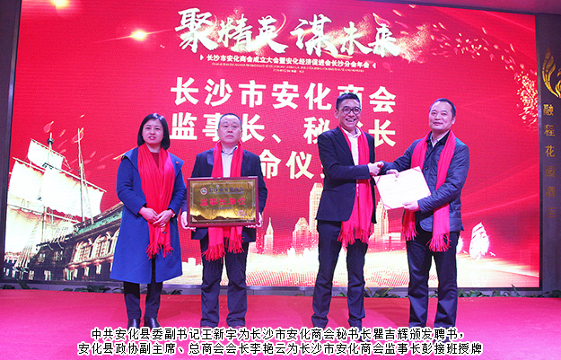 為了更好的加強安化籍企業(yè)家,鄉(xiāng)賢的相互聯(lián)系,更好的整合資源,打造溝通交流的平臺,實現(xiàn)合作共贏,進一步提升安化的影響力,增強安化人的影響力和凝聚力,安化商會應(yīng)運而生。湖南省政協(xié)常委、長沙市政協(xié)副主席、長沙市工商聯(lián)主席彭繼球宣讀商會選舉結(jié)果。綠之韻集團董事長胡國安當選長沙市安化商會會長,夏曉輝當選執(zhí)行會長,龍勝全、吳余生、夏義良、諶獻軍等當選副會長。與會領(lǐng)導(dǎo)為新當選的會長、執(zhí)行會長、監(jiān)事長授牌。同時,為了表彰為安化發(fā)展做出貢獻的杰出代表,大會授予盧虎行等八位安化籍代表“特殊貢獻獎”,安化經(jīng)濟促進會長沙分會理事長李蒲初先生為獲獎代表頒獎。