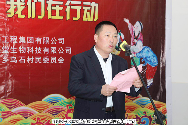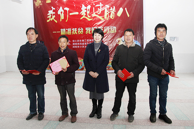 辭舊迎新,喜迎八方來賓;寒冬送暖,共助精準(zhǔn)扶貧。2018年1月24日,為了深入貫徹黨的十九大精神,扎實做好精準(zhǔn)扶貧工作,進(jìn)一步增進(jìn)幫扶企業(yè)和群眾之間的感情,在臘八節(jié)濃濃的節(jié)日氛圍中,由綠之韻集團主辦、湖南胡茂盛堂生物科技有限公司和瀏陽市小河鄉(xiāng)烏石村協(xié)辦的“精準(zhǔn)扶貧,我們在行動”主題活動——烏石農(nóng)產(chǎn)品直購會和項目簽約啟動會成功舉行。小河鄉(xiāng)黨委副書記、鄉(xiāng)長梁民,瀏陽經(jīng)開區(qū)管委會紀(jì)檢監(jiān)察室主任助理鄧水平,烏石村村支部書記賴平;綠之韻集團董事總裁、綠之韻公益基金會理事長勞嘉,綠之韻集團黨委書記劉云、副書記許達(dá)仲一行,與烏石村黨員、群眾、村組干部等近百人參加此次活動。