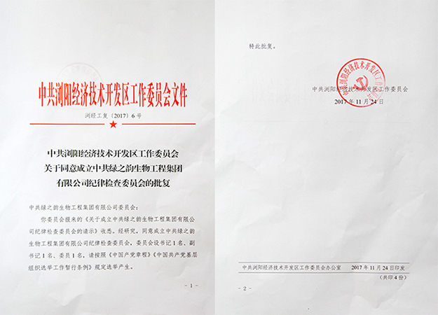 2017年12月19日,中共綠之韻生物工程集團(tuán)有限公司紀(jì)律檢查委員會成立暨第一屆委員選舉大會成功召開。會上,根據(jù)中共瀏陽經(jīng)濟(jì)技術(shù)開發(fā)區(qū)工作委員會[2017]6號文件批復(fù),中共綠之韻生物工程集團(tuán)有限公司紀(jì)律檢查委員會正式成立。會上選舉并產(chǎn)生了第一屆紀(jì)委班子。綠之韻集團(tuán)常務(wù)副總經(jīng)理胡均安,副總經(jīng)理梅其慧,黨委書記劉云、副書記許達(dá)仲攜各黨支部書記、全體黨員參加會議。本次大會還特別邀請了瀏陽經(jīng)開區(qū)黨群工作局科長李慶參加會議。