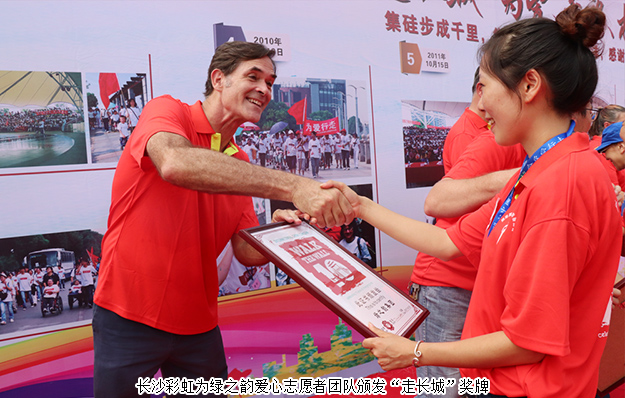 用腳步丈量愛心,用公益詮釋生命。活動結(jié)束后,愛心志愿者和其他愛心團隊成員、義工們彼此分享了行走過程中感人的故事和感悟。來自長沙彩虹的國際義工和晨光中心的孩子們?yōu)橹驹刚邆儙砹司臏蕚涞母卸鞔鹬x節(jié)目。閉幕式上,綠之韻集團董事總裁、綠之韻公益基金會理事長勞嘉為本次活動致辭:今年,是長沙彩虹“走長城”活動的第十一個年頭,綠之韻愛心志愿者已連續(xù)多年參加了此項公益活動。我們攜手與孩子們一起行走,以實際行動號召各界愛心人士、企業(yè)參與到公益慈善的行列,為孤殘兒童獻愛心。奉獻一份愛心,就能點燃一片希望。今后,綠之韻將一如既往地支持各項公益慈善事業(yè),用實際行動去詮釋愛,傳遞愛,分享愛?;顒幼詈?,國際義工們還為愛心團隊、綠之韻愛心志愿者團隊頒發(fā)了“走長城”證書。