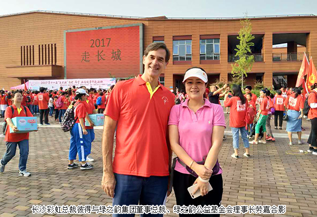 2017年9月23日,長沙彩虹全球第十一屆長沙“走長城”活動在西湖文化園舉行。長沙彩虹總裁彼得、長沙市第一社會福利院龍環(huán)攜手來自社會各界的45個愛心團隊共計1200余人,陪伴長沙彩虹孤殘兒童一起為愛行走。綠之韻集團董事總裁、綠之韻公益基金會理事長勞嘉,綠之韻公益基金會秘書長蔣文攜手30余位綠之韻愛心志愿者助力公益。