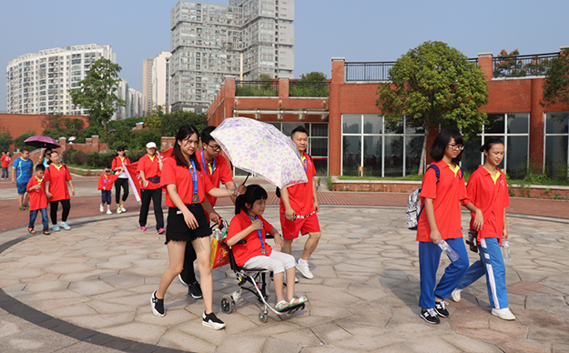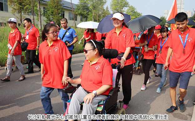簡短開幕儀式以后,“走長城”(長沙站)公益活動正式開始。來自社會各界的愛心志愿者們從南大門出發(fā),按照指定的路線沿著西湖文化園開始為愛行走。一路上,處處可見穿著統(tǒng)一的紅色公益文化衫的愛心志愿者,他們有的三五成群,奮力競走,好似團隊之間在進行小比拼;有的一家三口全員出動,帶著小孩漫步在西湖畔,沉浸在感知愛、傳遞愛、奉獻愛的氛圍。行走的隊伍中,還有一些借助輪椅、助行器步伐緩慢的孩子,他們是長沙彩虹晨光中心的孤殘兒童。行動不便的他們在志愿者的攙扶與鼓勵中,克服身體障礙,堅毅前行,挑戰(zhàn)5公里行走。行走的愛心志愿者隊伍很快便吸引了不少周邊民眾的廣泛關(guān)注,在此休閑、晨練的民眾們從志愿者處了解到此次公益活動的目的后深受感動,自覺加入到愛心隊伍當中,一起為公益行走。