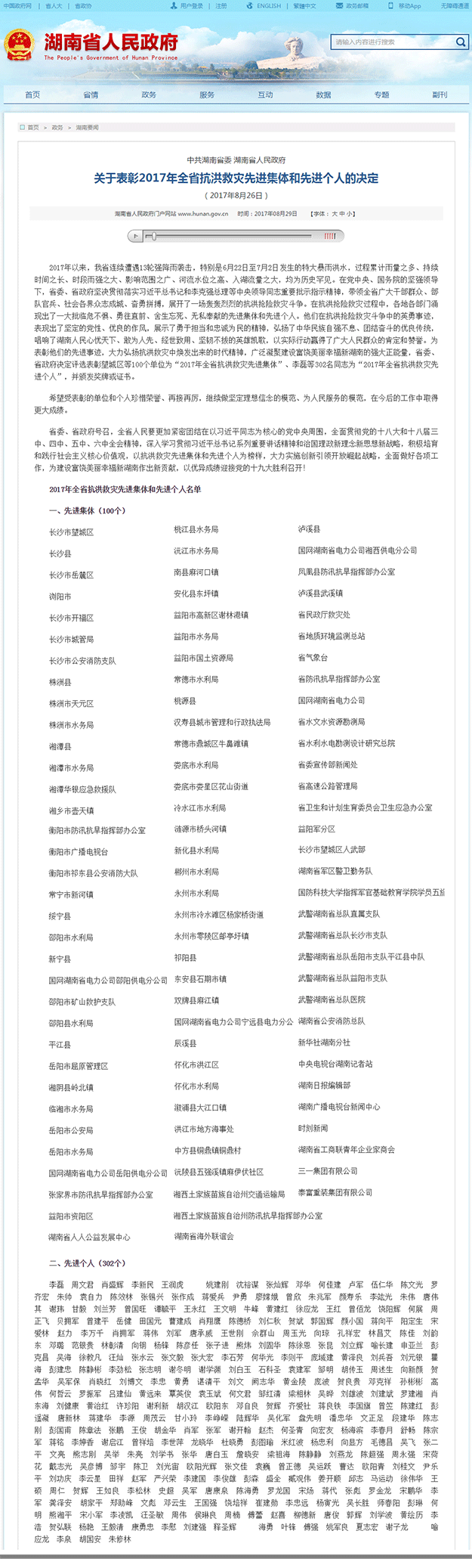 2017年8月28日,湖南省抗洪救災(zāi)總結(jié)大會在長沙召開,回顧總結(jié)抗洪救災(zāi)工作,表彰先進集體和先進個人,激勵全省廣大干部群眾弘揚抗洪精神,大力實施創(chuàng)新引領(lǐng)開放崛起戰(zhàn)略,為加快建設(shè)富饒美麗幸福新湖南而努力奮斗。中共湖南省委書記、省人大常委會主任杜家毫,中共湖南省委副書記、省長許達哲出席會議并講話。會上,湖南省人民政府副省長楊光榮宣讀了《中共湖南省委湖南省人民政府關(guān)于表彰2017年全省抗洪救災(zāi)先進集體和先進個人的決定》,100個單位被授予“2017年全省抗洪救災(zāi)先進集體”、302名同志被授予“2017年全省抗洪救災(zāi)先進個人”,并頒發(fā)獎牌或證書。綠之韻集團董事長胡國安被光榮授予“2017年全省抗洪救災(zāi)先進個人”榮譽稱號。