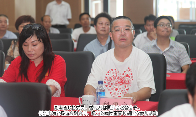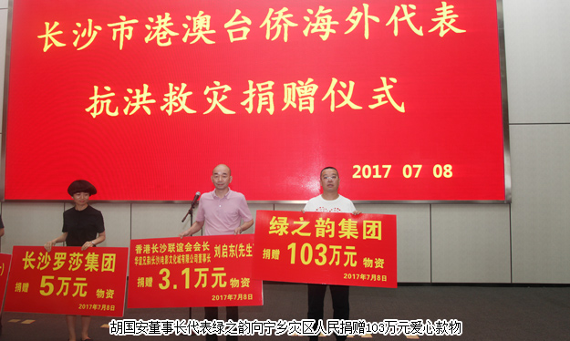 2017年7月8日,心連心、共命運(yùn)——長(zhǎng)沙市港澳臺(tái)僑海外代表抗洪救災(zāi)捐贈(zèng)活動(dòng)在寧鄉(xiāng)舉行,中共長(zhǎng)沙市委常委、統(tǒng)戰(zhàn)部部長(zhǎng)譚小平,長(zhǎng)沙市政協(xié)黨組織副書(shū)記、副主席石長(zhǎng)松,中共長(zhǎng)沙市委統(tǒng)戰(zhàn)部常務(wù)副部長(zhǎng)劉映群,中共長(zhǎng)沙市委統(tǒng)戰(zhàn)部副部長(zhǎng)、市僑聯(lián)黨組書(shū)記王國(guó)平,中共長(zhǎng)沙市委統(tǒng)戰(zhàn)部副部長(zhǎng)、市臺(tái)辦主任袁義和等領(lǐng)導(dǎo)出席活動(dòng)。湖南省政協(xié)委員、香港湘都同鄉(xiāng)會(huì)名譽(yù)會(huì)長(zhǎng)、長(zhǎng)沙市海外聯(lián)誼會(huì)副會(huì)長(zhǎng)、綠之韻集團(tuán)董事長(zhǎng)胡國(guó)安,長(zhǎng)沙市政協(xié)常委、香港長(zhǎng)沙聯(lián)誼會(huì)執(zhí)行會(huì)長(zhǎng)、善德集團(tuán)董事長(zhǎng)張曉琴,湖南省綠之韻公益基金會(huì)秘書(shū)長(zhǎng)蔣文、副會(huì)長(zhǎng)胡武安等與數(shù)十名長(zhǎng)沙市港澳臺(tái)僑海外代表企業(yè)家共同參與活動(dòng),并通過(guò)牽頭募捐和以身作則,共籌集619余萬(wàn)愛(ài)心款物深入寧鄉(xiāng)重災(zāi)區(qū),希望幫助受災(zāi)群眾早日重建家園、恢復(fù)正常生活秩序。