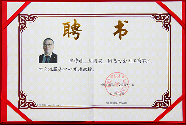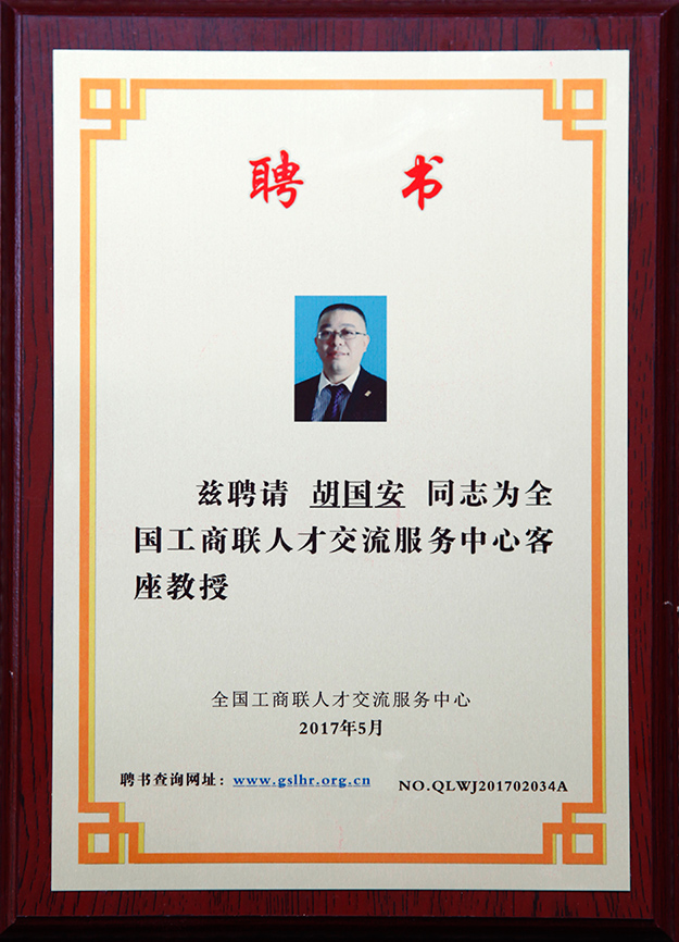 日前,經(jīng)全國工商聯(lián)人才交流服務(wù)中心專家委員會評定,綠之韻集團董事長胡國安被全國工商聯(lián)人才交流服務(wù)中心聘為客座教授。此次評定從實踐經(jīng)驗、理論水平和授課能力等三個維度進行嚴格審核,專家委員會對胡國安先生的評審意見為:“本人及所在單位具有良好的社會聲譽;具有較高的創(chuàng)業(yè)、管理經(jīng)驗及較高理論授課水平;熱衷于大學生培訓就業(yè)工作,具備傳播先進經(jīng)營管理經(jīng)驗和理念的能力?!?br/>
