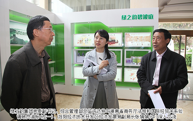 在深入親切的交談中,瀏陽經(jīng)濟(jì)技術(shù)開發(fā)區(qū)經(jīng)濟(jì)發(fā)展局副局長張娟娟表示:作為瀏陽經(jīng)濟(jì)技術(shù)開發(fā)區(qū)代表企業(yè),綠之韻集團(tuán)不僅高度重視產(chǎn)品品質(zhì),規(guī)范企業(yè)管理,深耕企業(yè)文化,在利稅、創(chuàng)業(yè)就業(yè)、“三農(nóng)”建設(shè)、黨團(tuán)工作、公益事業(yè)等方面的貢獻(xiàn)尤為突出。湖南省商務(wù)廳法規(guī)和國際經(jīng)貿(mào)關(guān)系處調(diào)研員游標(biāo)指出:目前湖南省商務(wù)廳為宣傳、推介我省企業(yè)和產(chǎn)品,促進(jìn)企業(yè)“走出去”和產(chǎn)品的進(jìn)出口,正在布置援外培訓(xùn)工作。綠之韻集團(tuán)是湖南本土知名企業(yè),積極拓展海外市場,軟硬件設(shè)施也較為齊備,未來或?qū)⒆鳛椤爸袊鴮ν庠嘤?xùn)湖南實訓(xùn)基地”供學(xué)員對接,為湖南開放型經(jīng)濟(jì)發(fā)展架橋拓市貢獻(xiàn)力量。