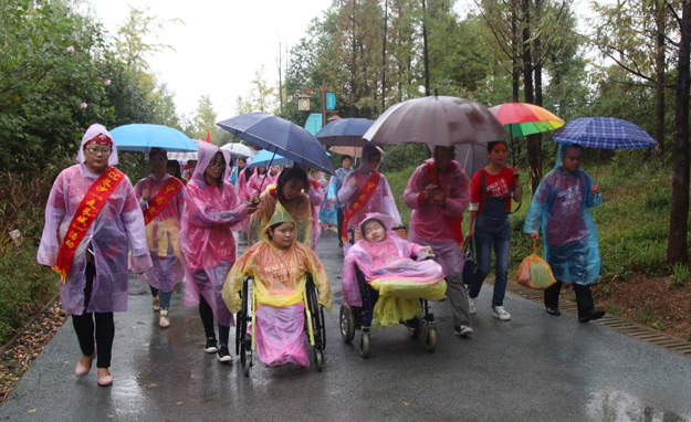 “愛使我們在一起,我們手拉手;愛是我們的回答,面對(duì)挑戰(zhàn);希望是我們的祝福,手拉手、心相連,我們是一家人。”愛心志愿者們?nèi)宄扇?,沿著既定的線路徒步前行,大家或打著雨傘、或穿著雨衣,以眼神鼓勁,用微笑問候,憑借著堅(jiān)韌的意志和奉獻(xiàn)愛心的渴望,全部走完既定的環(huán)公園路程,安全返回,互致勝利的祝福,并合影紀(jì)念。