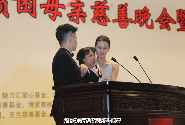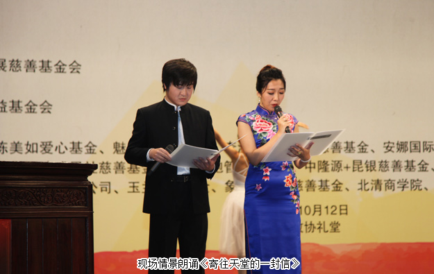 晚會現(xiàn)場情景朗誦《寄往天堂的一封信》讓現(xiàn)場觀眾凄然淚下。故事是根據(jù)吉林省貧困母親于桂華女士和女兒得大病至到女兒病逝的真實事件,在北京求助過程中得到了“關(guān)愛貧困母親”項目的大力幫助。于桂華來的現(xiàn)場,她說目前最大的愿望就是回報社會,感恩幫助過的好心人。