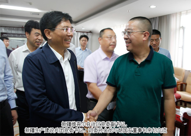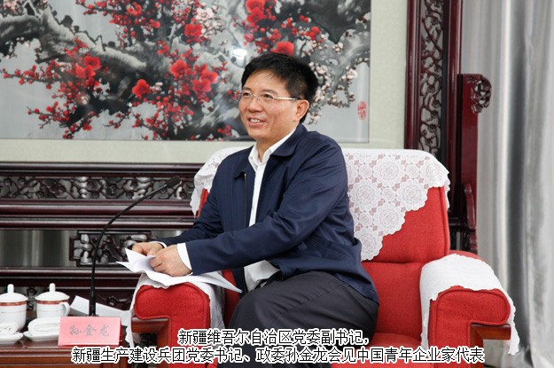 6月18日上午,新疆維吾爾自治區(qū)黨委副書(shū)記,新疆生產(chǎn)建設(shè)兵團(tuán)黨委書(shū)記、政委孫金龍?jiān)诒鴪F(tuán)機(jī)關(guān)綜合樓會(huì)見(jiàn)了 “中國(guó)青年企業(yè)家兵團(tuán)行”經(jīng)貿(mào)考察活動(dòng)的青年企業(yè)家一行。會(huì)見(jiàn)代表有中國(guó)青年企業(yè)家協(xié)會(huì)常務(wù)副會(huì)長(zhǎng)、共青團(tuán)中央青年發(fā)展部部長(zhǎng)楊松, 中國(guó)青年企業(yè)家協(xié)會(huì)常務(wù)理事、湖南省青年企業(yè)家協(xié)會(huì)副會(huì)長(zhǎng)、綠之韻集團(tuán)董事長(zhǎng)胡國(guó)安等中國(guó)青年企業(yè)家協(xié)會(huì)領(lǐng)導(dǎo)和30名企業(yè)家。新疆建設(shè)兵團(tuán)黨委常委、副政委徐偉華,兵團(tuán)黨委常委、副司令員、秘書(shū)長(zhǎng)李新明,兵團(tuán)工業(yè)和信息化委員會(huì)黨組書(shū)記、主任丁頌國(guó),兵團(tuán)財(cái)務(wù)局黨組書(shū)記、局長(zhǎng)李萍,兵團(tuán)商務(wù)局黨組書(shū)記、局長(zhǎng)王多生,兵團(tuán)團(tuán)委黨組書(shū)記、書(shū)記芮宏等領(lǐng)導(dǎo)參加會(huì)見(jiàn)。