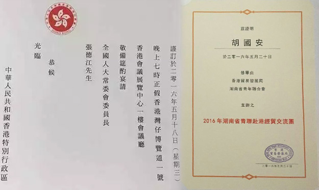 2016年5月16-20日,由湖南省青年聯(lián)合會和香港貿(mào)易發(fā)展局聯(lián)合舉辦的“2016湘港經(jīng)貿(mào)合作交流會”在香港會展中心舉行。共青團(tuán)湖南省委書記、省青聯(lián)主席湯立斌率湖南企業(yè)家組成的代表團(tuán)赴港參會,并舉辦赴港營商培訓(xùn)班。湖南省青聯(lián)副主席、綠之韻集團(tuán)董事長胡國安先生赴港考察學(xué)習(xí)。5月18日,由香港特區(qū)政府主辦的“一帶一路”高峰論壇在香港會展中心舉行,全國人大常委會委員長張德江作“發(fā)揮香港獨(dú)特優(yōu)勢,共創(chuàng)‘一帶一路’美好未來”的主題演講。代表團(tuán)認(rèn)真學(xué)習(xí)了會議精神,并就湘港聯(lián)手積極參與“一帶一路”建設(shè)開展座談研討。