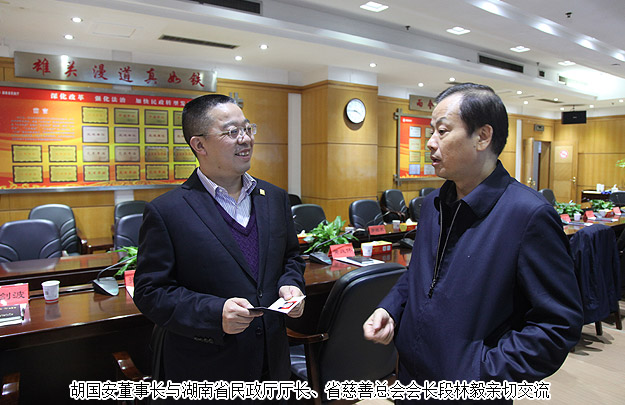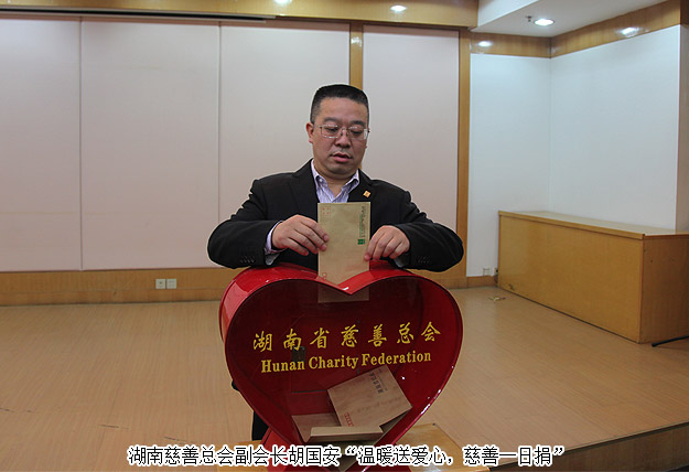 2016年1月6日,“2016年慈善一日捐”在省民政廳機(jī)關(guān)舉行捐贈(zèng)儀式活動(dòng),這標(biāo)志著湖南省慈善總會(huì)倡導(dǎo)的“2016年送溫暖獻(xiàn)愛(ài)心·慈善一日捐”活動(dòng)正式啟動(dòng),現(xiàn)場(chǎng)注入第一筆愛(ài)心款84900元。湖南省民政廳廳長(zhǎng)、省慈善總會(huì)會(huì)長(zhǎng)段林毅作了動(dòng)員講話;湖南省政協(xié)原主席、省慈善總會(huì)會(huì)長(zhǎng)王克英同志,湖南省委原副書(shū)記謝康生、原湖南省人大常委會(huì)副主任羅桂求等省老領(lǐng)導(dǎo)出席了活動(dòng),并帶頭進(jìn)行捐贈(zèng)。湖南慈善總會(huì)副會(huì)長(zhǎng)、綠之韻集團(tuán)董事長(zhǎng)胡國(guó)安先生參與捐贈(zèng),同時(shí)為愛(ài)心捐贈(zèng)單位頒發(fā)榮譽(yù)證書(shū)。