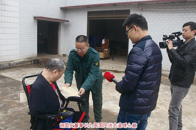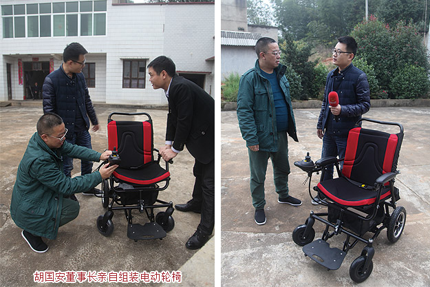 被周國(guó)民樂(lè)觀自強(qiáng)的精神所感動(dòng),綠之韻公益基金會(huì)攜手湖南經(jīng)視《鐘山說(shuō)事》欄目讓夢(mèng)想照進(jìn)現(xiàn)實(shí),幫周國(guó)民購(gòu)置了嶄新的電動(dòng)輪椅,圓了他的自由行動(dòng)夢(mèng)。綠之韻集團(tuán)胡國(guó)安董事長(zhǎng)親自將輪椅組裝好,并耐心指導(dǎo)使用。