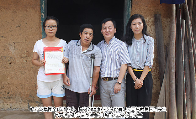 綠之韻集團(tuán)全球戰(zhàn)略委、綠之韻健康科技股份有限公司總裁易園翔先生代表綠之韻公益基金會為艷紅送去愛心助學(xué)金,并表示未來將持續(xù)關(guān)注艷紅的成長。
