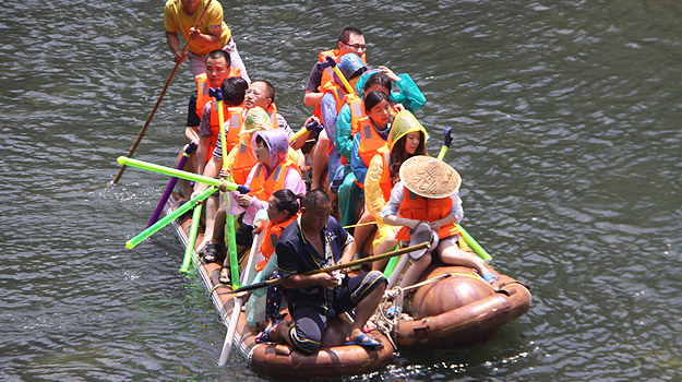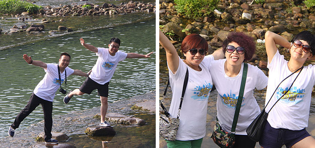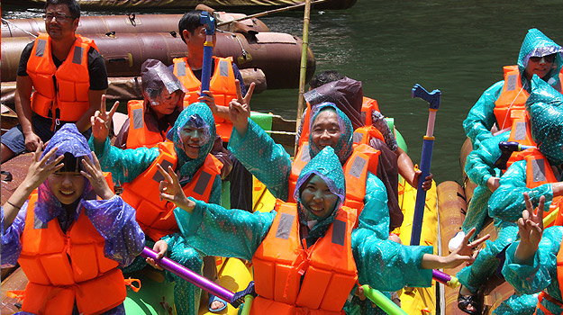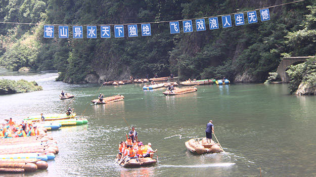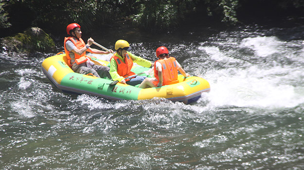 第二天上午,從“哈妮宮”出發(fā),順?biāo)拢蝗~扁舟,在原始次生林的高山峽谷之中,身著救身衣、乘皮舟、闖險灘、博激流、沿途觀美景、沐瀑流、打水仗、過峽關(guān),出沒浪端谷底,途徑三角巖、雞籠門、落水坑瀑布、夢思峽……數(shù)十個景點,絡(luò)繹而至,美不勝收。綠之韻家人在這里放歌長嘯,唱起了綠之韻戰(zhàn)歌,戲水嘻鬧,找回快樂的自我。