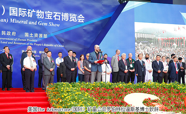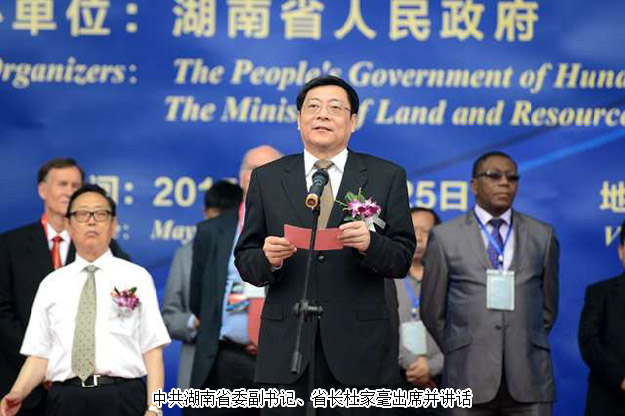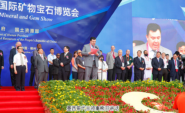 開幕式上,郴州市委書記易鵬飛、國外展商代表羅伯特?拉溫斯基、墨西哥代總領(lǐng)事熊羽分別致辭。美國圖森展原主席彼得?梅高、澳大利亞昆士蘭博物館聯(lián)盟主任蘇珊?米勒、美國著名礦物寶石收藏家基因?梅爾安等境外嘉賓,中國科學(xué)院院士莫宣學(xué),國土資源部、湖南省委、省人大、省政府、省政協(xié)領(lǐng)導(dǎo),國家相關(guān)部辦委領(lǐng)導(dǎo),礦博會(huì)組委會(huì)成員單位領(lǐng)導(dǎo),行業(yè)協(xié)會(huì)、礦山企業(yè)、參展商代表,50多家新聞媒體記者及群眾代表等參加了開幕式。