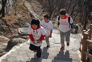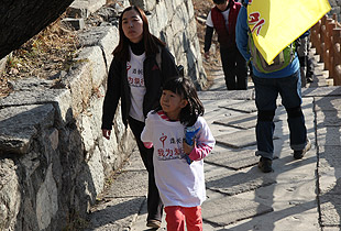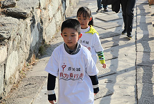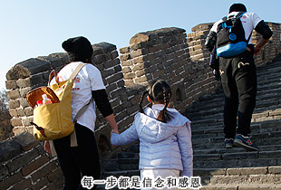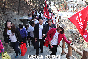 由于行進(jìn)道路比較狹窄、坡度較大,大家三五成群,從慕田峪長(zhǎng)城入口的中華夢(mèng)石城出發(fā),沿著北步道,一路意志堅(jiān)定,沿著幾里長(zhǎng)陡峭的石階拾級(jí)而上,手拉著手歡呼雀躍地向著長(zhǎng)城10號(hào)炮臺(tái)進(jìn)發(fā)。在這條人流中,匯聚著綠之韻愛(ài)心經(jīng)銷商、公務(wù)員、知識(shí)分子、企業(yè)老板、務(wù)工人員、學(xué)生……他們彼此并不相識(shí),博愛(ài)的名義卻把他們緊緊連在了一起。相識(shí)的、不相識(shí)的,大家揮舞慈善紅旗,以眼神鼓勁,用微笑問(wèn)候,朝著一個(gè)共同的夢(mèng)想、共同的愛(ài)心、共同的追求徒步前行。共沐大愛(ài)的心靈長(zhǎng)河,誰(shuí)人又不被感動(dòng)呢?