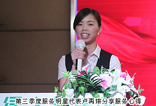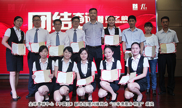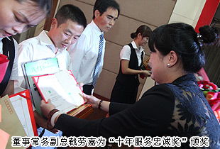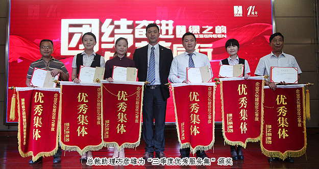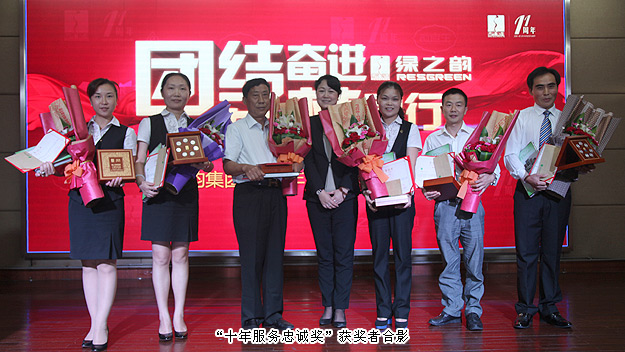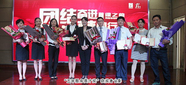 介紹了新晉高管及員工之后,會議最激動人心的時(shí)刻還是屬于頒獎環(huán)節(jié)。為表彰先進(jìn)典型,弘揚(yáng)企業(yè)文化,大會集中頒發(fā)了“三季度優(yōu)秀服務(wù)集體”、“三季度服務(wù)明星”、“五年服務(wù)英才獎”、“十年服務(wù)忠誠獎”等獎項(xiàng)。獲獎部門代表、個(gè)人依次踏上領(lǐng)獎臺,享受大家的聲聲祝福和熱烈掌聲,共同分享此時(shí)此刻的快樂。本次大會上,業(yè)務(wù)服務(wù)部、公共事務(wù)部、湖南分公司、保安組、日用品制作組喜獲“三季度優(yōu)秀服務(wù)集體獎”,侯俊霞、陳敏、趙蕾、湛亮、楊恬、阮毅、李恒華、文冰、盧再琳、李明、伍成輝、楊會英、鄒建華、肖巧林、胡國純、胡樹峰、趙潔、費(fèi)陽、曹葉、樊俊杰榮獲“三季度服務(wù)明星”殊榮;王芬、陳敏、周洋、高芳、李明、雷竹蘭、黃付行、侯立新、黃繼民、王麗、梁涌、李哲、呂晶榮膺“五年服務(wù)英才獎”,董事常務(wù)副總裁勞嘉上臺頒發(fā)了香港周大福珠寶公司特約設(shè)計(jì)師量身定做的、鐫刻獲獎?wù)呙值淖憬饦s譽(yù)徽章和獎金;許達(dá)仲、馮紅、黃莎莎、王艷、許鵬翔、王興良榮膺“十年服務(wù)忠誠獎”,不僅收獲了全體綠之韻人的祝福和尊敬,還榮獲了60萬元購房補(bǔ)貼金、10萬元企業(yè)年金獎勵金、2萬元的家庭帶薪旅游基金和由香港周大福獨(dú)家設(shè)計(jì)的金銀幣紀(jì)念獎?wù)隆?/span>