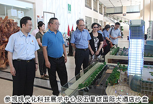 考察過程中,各位領(lǐng)導首先參觀了綠之韻集團辦公大樓。從企業(yè)文化展區(qū)、現(xiàn)代化科技展示中心及五星級國際大酒店沙盤,到產(chǎn)品展示廳、黨團工作展示區(qū)……長沙市中級人民法院副院長黎軍、長沙市人民檢察院副檢察長祝珍明、長沙市僑聯(lián)主席翁少蘭等領(lǐng)導在胡國安董事長的陪同下,邊走邊看,仔細詢問,不時點頭稱贊。