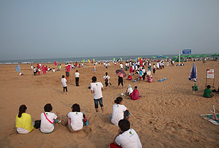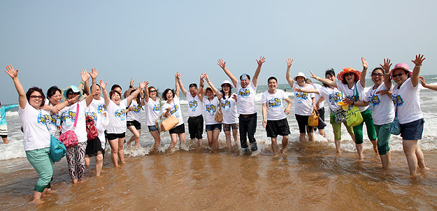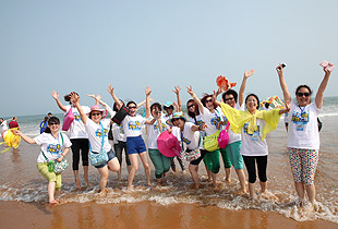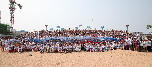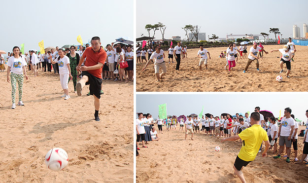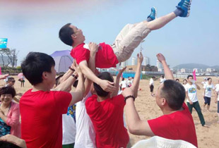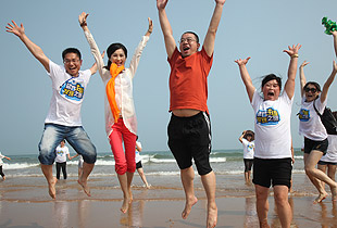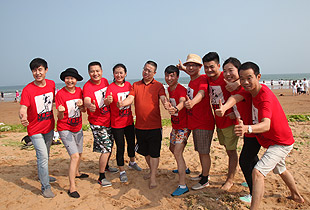 青島的海是獨(dú)一無(wú)二,享有“中國(guó)夏威夷”美譽(yù)的黃島沙灘更是令人神往不已。這不,中午時(shí)分,剛剛用完自助餐,綠之韻精英們就早已迫不及待,朝它狂奔去……在水天相接的地方,輪船一艘艘,輕舟一葉葉,白帆一點(diǎn)點(diǎn)。淺海處,身著短褲、泳衣的綠之韻精英們,男女老少,擊波游泳、踏濤沖浪,或做人體沙雕、坐摩天環(huán)車(chē),笑聲不絕……海水、輪船、輕舟、白帆,綠之韻人和大自然構(gòu)成了一副五彩斑駁的畫(huà)卷,美不勝收。累了,倦了,精英們坐在一把把五顏六色的太陽(yáng)傘下,或喝飲料聊天、暢談夢(mèng)想,或舉目遠(yuǎn)眺,靜賞美景。看,那些童心未泯的綠之韻精英們,有的在試圖尋找貝殼,有的在追逐嬉戲,有的在騰空留影……其樂(lè)無(wú)窮。