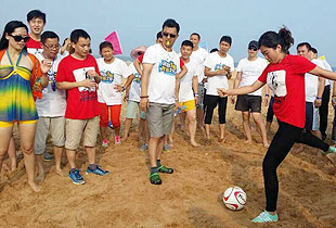 舉世矚目的足球世界杯在巴西激戰(zhàn)正酣,一場(chǎng)綠之韻精英的沙灘足球賽也隨之拉開(kāi)戰(zhàn)幕。胡國(guó)安董事長(zhǎng)親自為本場(chǎng)比賽開(kāi)球,參加比賽的十三個(gè)VIP團(tuán)激情碰撞,作對(duì)廝殺,光著腳在松軟的沙灘上帶球、過(guò)人、射門(mén)的感覺(jué)與草坪上截然不同,比賽中參賽的家人們經(jīng)常出現(xiàn)沙土飛揚(yáng),人仰馬翻的場(chǎng)景,相當(dāng)有趣味。臨近傍晚,經(jīng)過(guò)將近四個(gè)多小時(shí)小組賽、淘汰賽、半決賽、決賽的緊密、激烈賽程,4個(gè)VIP團(tuán)脫穎而出。最終,綠之韻精英VIP5團(tuán)、VIP2團(tuán)、VIP7團(tuán)和VIP11團(tuán),分列冠亞季軍。VIP5團(tuán)隊(duì)員在比賽后慶祝勝利時(shí)將奪冠功臣夏運(yùn)良拋向空中,收獲了全場(chǎng)家人們熱烈的掌聲和尖叫聲!