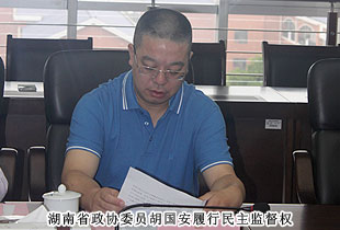據(jù)了解,湖南省優(yōu)秀政協(xié)委員、綠之韻集團董事長胡國安于2014年5月7日正式當(dāng)選省政協(xié)派駐省工商行政管理局(首批聘用)民主監(jiān)督員后,先后參與“應(yīng)邀參加派駐單位的有關(guān)會議和活動,對派駐單位相關(guān)工作開展視察、調(diào)研和走訪,收集、了解和反映社情民意,監(jiān)督省政協(xié)建議案、提案的辦理落實情況”等一系列活動,為湖南省工商局各項工作的推進提出了合理化意見和建議。同時,作為監(jiān)督員,胡國安委員倍感責(zé)任重大。他表示,成為民主監(jiān)督員,是身為政協(xié)委員的我知情、問政、獻智、出力的重要途徑,我將努力把民主監(jiān)督由“軟”變“硬”,由“虛”變“實”,由“被動”變“主動”,成為推進民主監(jiān)督組織化、具體化,推動政協(xié)履行職能制度化、規(guī)范化、程序化的重要形式和有效載體。使命光榮,責(zé)任壓肩,一定不會辜負黨和人民的重托和期許,不斷加強自身學(xué)習(xí),多聯(lián)系、多交流、多溝通,遵循“懂行、明責(zé)、知情”六字訣,快速進入角色,努力做組織放心、派駐單位歡迎,人民群眾滿意的監(jiān)督員。
