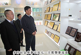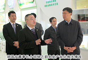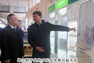 考察領導小組一行參觀了綠之韻集團總部基地及產(chǎn)品展示廳,“綠色、天然、環(huán)保、健康、養(yǎng)生”的產(chǎn)品研發(fā)理念,以產(chǎn)、學、研結合為模式組建的產(chǎn)品科研團隊都受到了安七一主席的充分肯定?!盀榱舜_保產(chǎn)品的品質(zhì),我們希望能夠更為全面的控制產(chǎn)品生物鏈上的所有環(huán)節(jié),包括原料、研發(fā)、生產(chǎn)和銷售,以打造綠之韻‘全產(chǎn)業(yè)鏈條’的產(chǎn)業(yè)結構。先后與南京大學、湖南農(nóng)業(yè)大學、湖南中醫(yī)藥大學等科研機構、院校展開戰(zhàn)略合作,全力打造‘產(chǎn)學研’成功合作典范。目前‘綠之韻’已被認定為高新技術企業(yè),我們擁有五大生產(chǎn)基地,其中益陽萬畝中藥材種植基地,為我們的保健食品提供了優(yōu)質(zhì)的產(chǎn)品原料”,綠之韻集團董事常務副總裁勞嘉向考察團一行匯報。