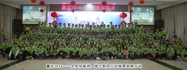 在這個節(jié)日氣氛尚未褪盡的初春時節(jié),為增強(qiáng)員工的團(tuán)隊凝聚力,提高主動配合意識和協(xié)同能力,促使大家勇于挑戰(zhàn)自我,挖掘潛力,分秒必爭,達(dá)成目標(biāo),進(jìn)一步積極、全面和深入地弘揚(yáng)“厚德載物、目標(biāo)堅定、有容乃大、低調(diào)實干、勇往直前、厚積薄發(fā)、團(tuán)隊制勝、堅持到底、整合資源、改變自我”的綠之韻“水文化”,綠之韻集團(tuán)組織全體員工進(jìn)行了為期三天兩晚的“贏定2014——全員向前沖”訓(xùn)練營活動。