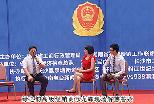 湖南省打擊傳銷工作聯(lián)席會議辦公室主任、湖南省工商局副局長魯先華,湖南省打擊傳銷工作聯(lián)席會議辦公室副主任、湖南省經(jīng)濟檢查總隊總隊長毛愛倫,湖南省經(jīng)濟檢查總隊副總隊長肖向陽,長沙市工商局黨組書記、局長卓精華,長沙市工商局黨組副書記、副局長潘虹,長沙縣人民政府副縣長、公安局長曾衛(wèi)國,長沙縣工商局黨組書記、局長舒曲等領(lǐng)導(dǎo)和嘉賓蒞臨活動現(xiàn)場指導(dǎo)。綠之韻集團受邀參與此次活動,湖南分公司代表、高級經(jīng)銷商蘇龍輝先后與主持人、居民朋友進行一問一答式互動,贏得了現(xiàn)場陣陣熱烈的掌聲。