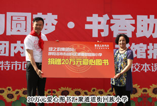孩子是祖國的花朵,書是祖國的未來。在這個信息量巨大的社會,孩子的求知欲望從簡單的課本知識已經(jīng)延伸到生活的各個知識層面。臨近“六一”,內(nèi)蒙古呼和浩特市回民區(qū)通道街回族小學(xué)的孩子們收到了一份沉甸甸的兒童節(jié)禮物——“綠之韻集團內(nèi)蒙古愛心圖書館”正式在這里落戶。2013年5月31日,綠之韻集團將價值20萬元的愛心圖書送到了通道街回族小學(xué),為孩子們送去了寶貴的知識財富,也為他們打開了一扇“希望之窗”。綠之韻集團市場營銷中心(中國區(qū))副總經(jīng)理諶獻軍、市場營銷中心(中國區(qū))市場總監(jiān)劉維利、綠之韻集團內(nèi)蒙古分公司經(jīng)理侯立新、綠之韻集團國際商學(xué)院特聘講師李娜、邵亦冉,以及內(nèi)蒙古經(jīng)銷商發(fā)展委員會王連坤、郝建兵、張聞英、張聞華、喬桂英等20多位委員出席了活動。
